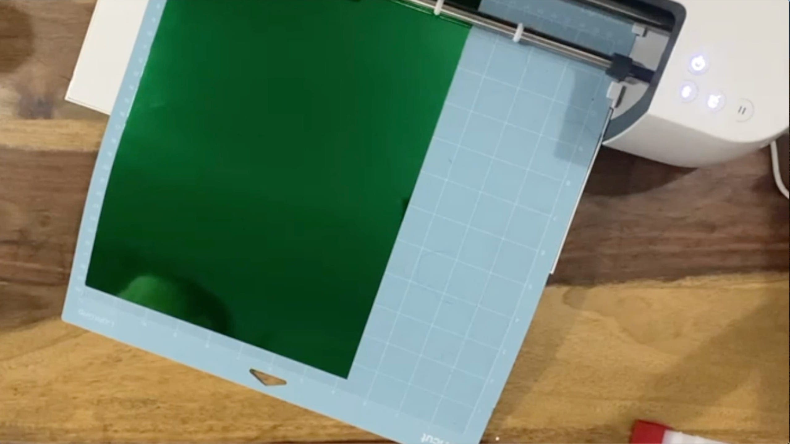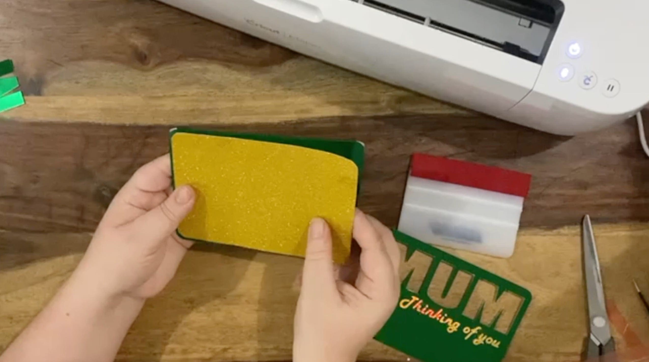 5. Position the A4 card on the cutting mat and apply pressure with the Squeegee to it to make sure it is secure. The Glitter or Holographic side should be face up on the mat Load your Mat using the up arrow on the machine , select cut using the white flashing cricut button on your machine.