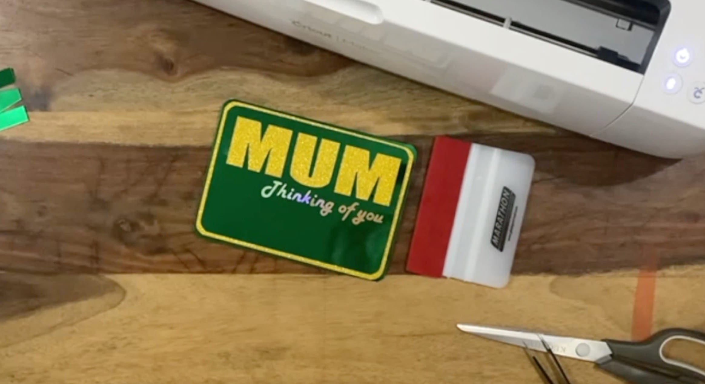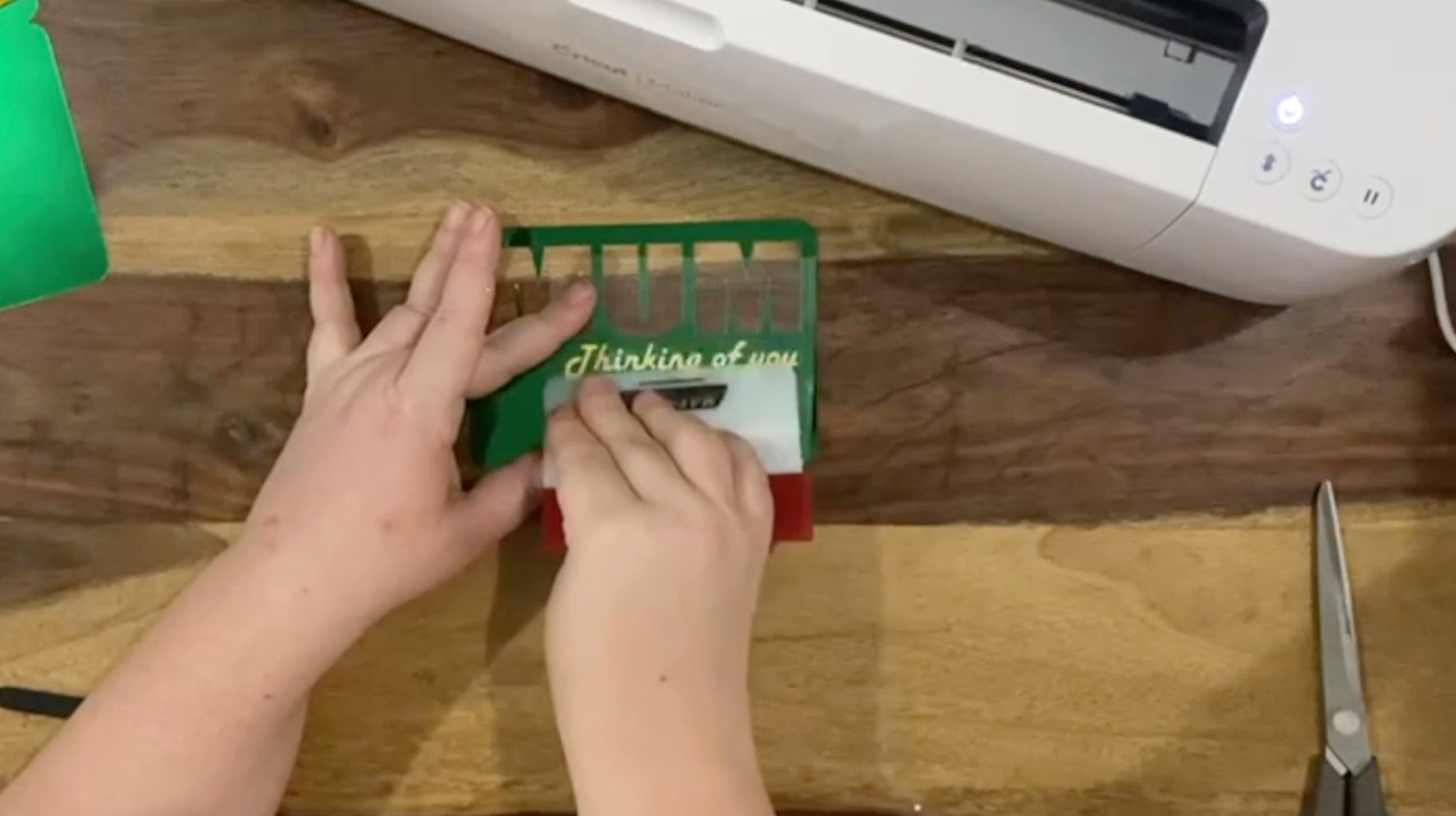 8. When your design is cut and weeded, you just need to cut a piece off a piece of transfer tape to fit your project and smooth it down on top of the design. Once smoothed down, please turn it over and rub the back of the vinyl so it adheres to the transfer tape from behind the vinyl, using a squeegee. If it has not transferred fully to the tape keep rubbing with more force with the transfer tape on the table and the back of the vinyl paper facing you so you push it onto the transfer tape,( not back onto the backing paper). You can then peel the transfer tape up, bringing the decal with it and off of the backing. Your decal has now moved to the transfer paper and is ready to be carried to your project surface. Apply the vinyl sentiment to the front of your MUM layer.