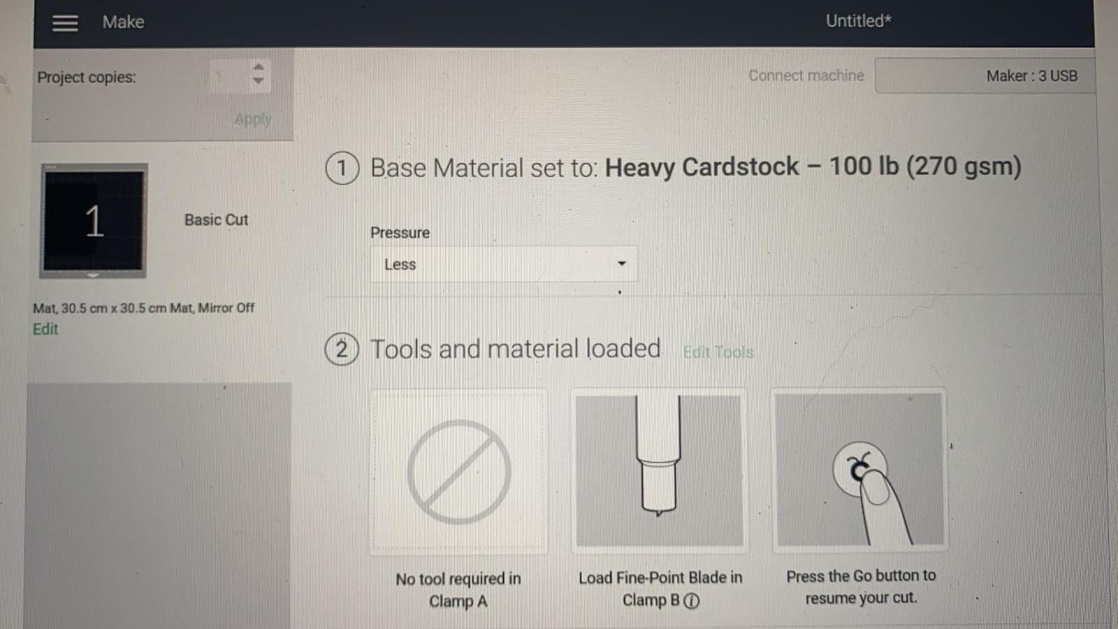 Mirror Card Cut setting – Heavy card stock , Pressure setting- less