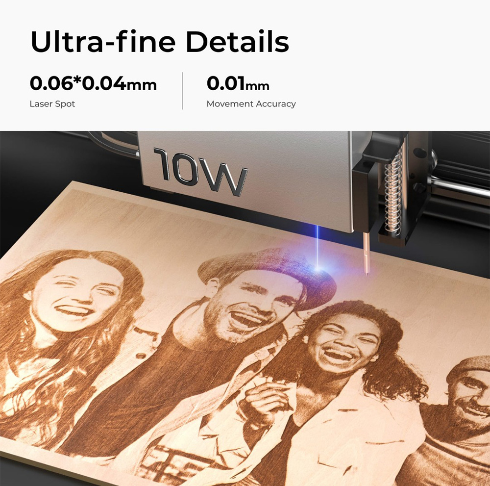 It supports interchangeable laser modules (10W base, plus upgrades to 20W, 40W and IR metal-engraving heads) so you can start with the 10W and grow into more capability.